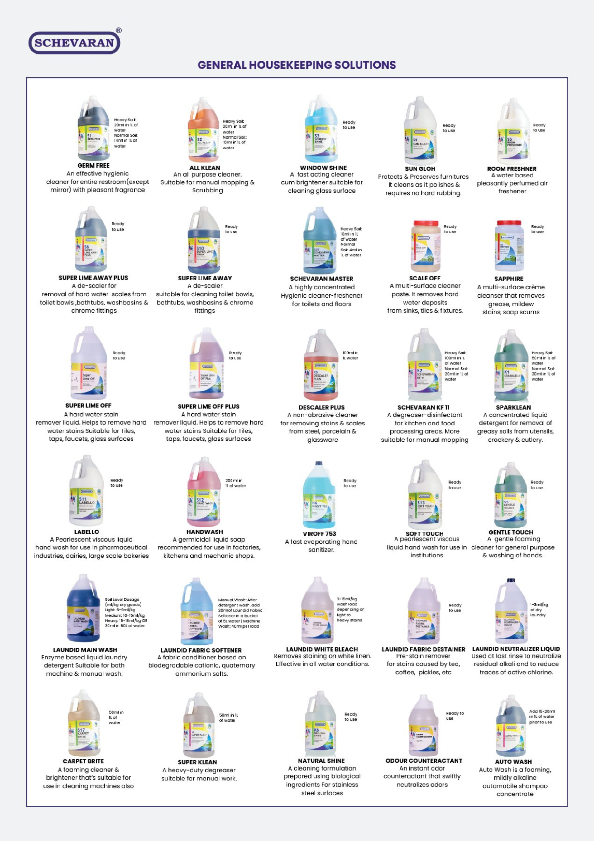 A and N Enterprises is a authorized distributor of Schevaran chemicals products which includes Hotels Chemicals. Hospitals Chemical , House keeping chemicals & Laundries Chemicals.